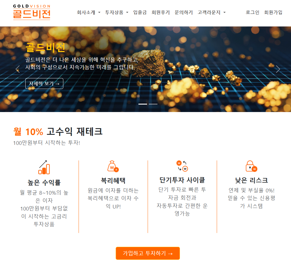 본 사안은 ' 골드비전(GOLDVISION) '이라는 허위의 금 투자 플랫폼을 표방하면서 금 거래 투자상품에 투자를 하면 매일 안정적으로 0.2% ~ 0.7%의 배당수익을 얻을 수 있다고 홍보하면서 피해자들에게 투자를 유도하고 있는 사안입니다. [*****실제 인물 및 회사와는 전혀 무관한 사칭형 사기조직이기 때문에 절대 주의를 요합니다.].
