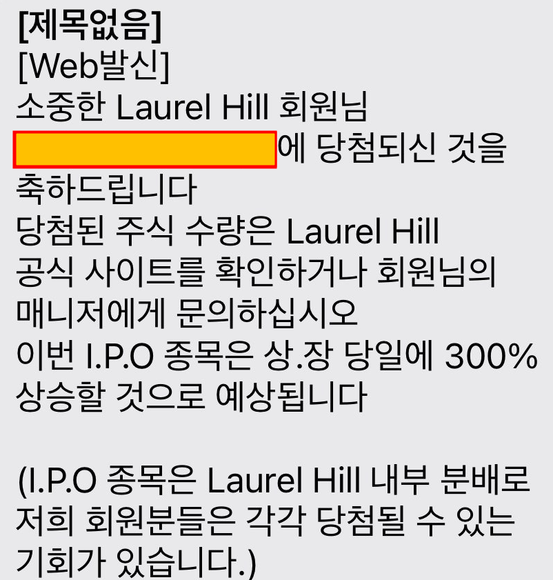 본 사안은 'Laurel Hill(로렌힐) 인베스트먼트'라는 투자회사를 표방하여 공모주 투자(IPO) 등을 통해 상장당일 300% 이상의 수익을 얻을 수 있다고 홍보하면서 피해자들에게 투자를 유도하고 있는 사안입니다. [*****실제 인물 및 회사와는 전혀 무관한 사칭형 사기조직이기 때문에 절대 주의를 요합니다.].