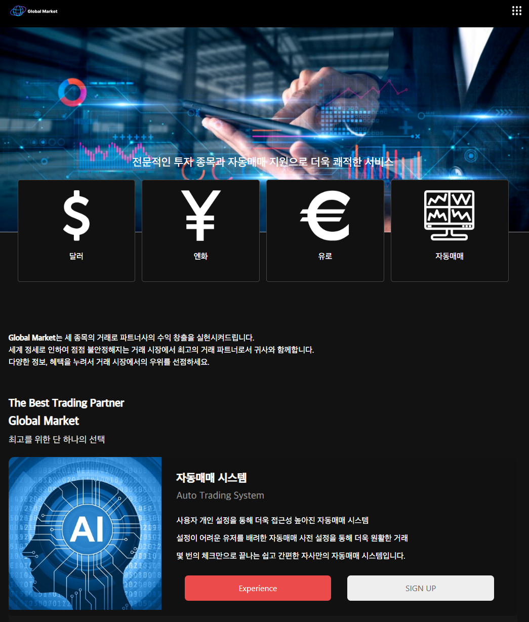 본 사안은 'GLOBAL MARKET'이라는 허위의 MTS(Mobile Trading System) 어플을 표방하면서 해외 선물 투자상품에 투자를 하면 큰 수익을 얻을 수 있다고 홍보하면서 피해자들에게 투자를 유도하고 있는 사안입니다. [*****실제 인물 및 회사와는 전혀 무관한 사칭형 사기조직이기 때문에 절대 주의를 요합니다.].