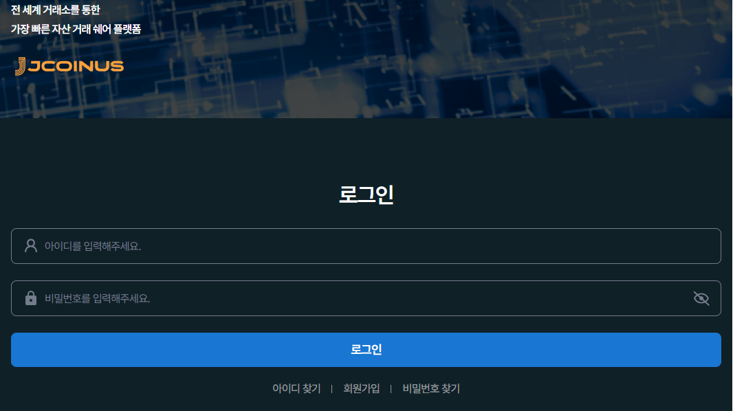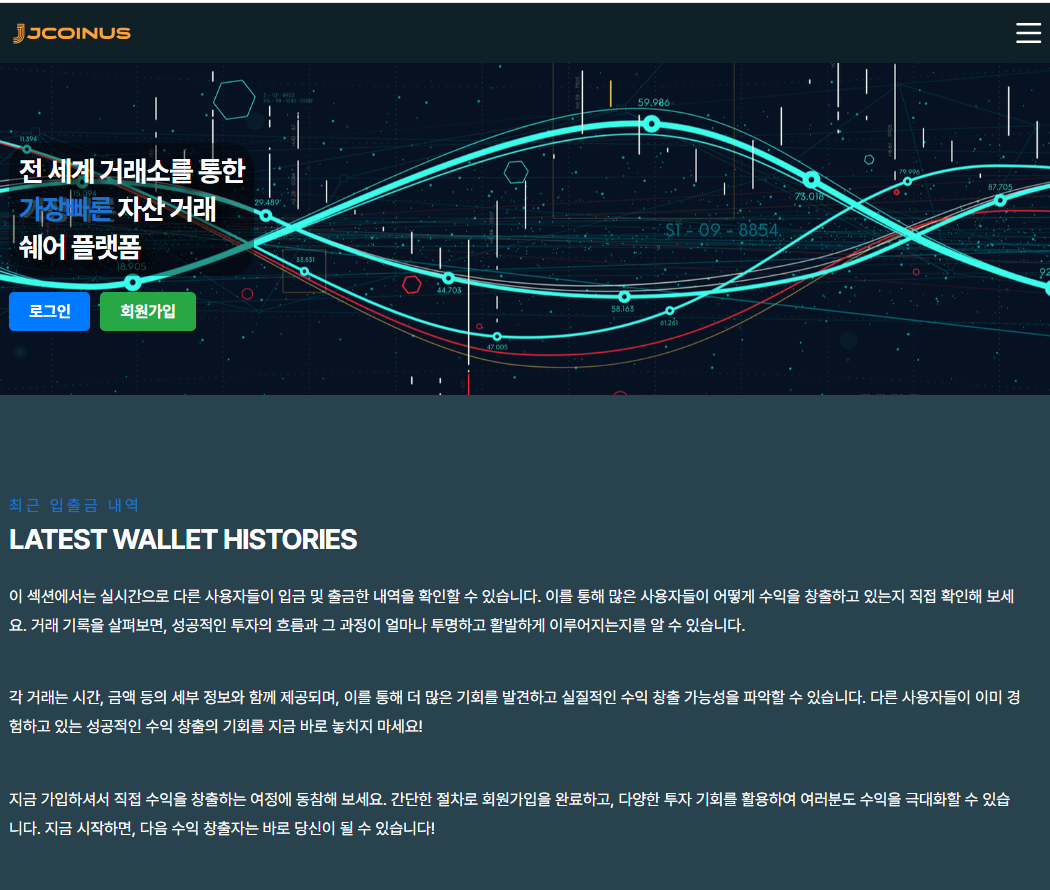 본 사안은 'JCOINUS'이라는 허위의 투자 플랫폼을 표방하면서 외환, 금, 코인 거래 투자상품에 투자를 하면 매일 고수익을 얻을 수 있다고 홍보하면서 피해자들에게 투자를 유도하고 있는 사안입니다. [*****실제 인물 및 회사와는 전혀 무관한 사칭형 사기조직이기 때문에 절대 주의를 요합니다.].