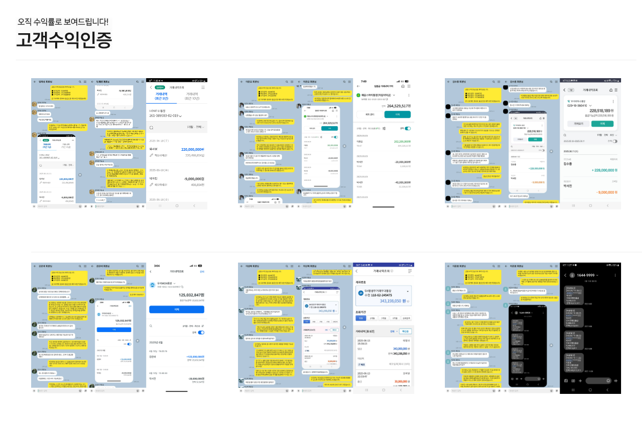 이러한 불법 사기 투자 행위의 경우 네이버 밴드방, 카카오톡 단체채팅방 등을 통해서 만족할만한 수익을 얻을 수 있다면서 홍보를 진행하고 있습니다. 이후 사기일당들은 미리 만들어 놓은 웹사이트에 피해자들의 가입을 유도하게되고 허위의 투자컨설팅 약정서까지 작성하게 하는 등 치밀한 준비까지 하며 피해자를 속이고, 피해자는 사기 일당의 리딩하에 지속적인 투자를 하게 됩니다. 그러면 상식적으로 얻을 수 없는 고수익이 위 웹사이트 화면에 표시됩니다.