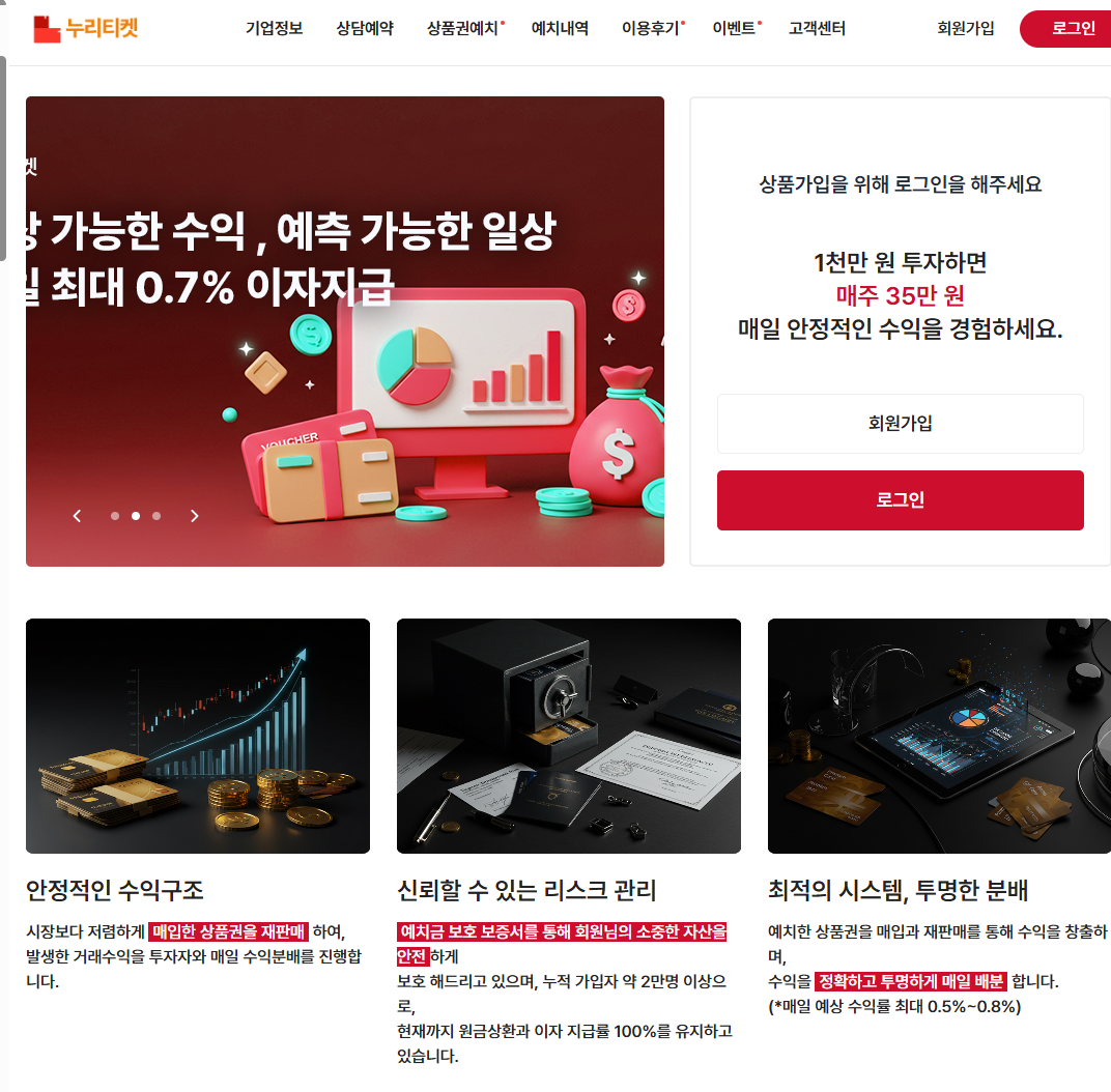 그럼에도 너무나도 그럴듯하게 만들어 놓은 터라 피해자들은 자신이 속고 있는지도 모르고 계속하여 투자를 이어나갑니다. 더욱이 가해자들은 피해자들이 자신이 사기를 당하고 있다는 것을 인지하지 못하게 하기 위하여 그럴 듯한 홈페이지를 만들어 놓는 것도 모자라, 블로그 글 등을 통하여 마치 누리티켓이 정상적인 업체인 것 처럼 가장하는 등 철저하게 피해자들의 눈과 귀를 가리는 파렴치한 행동까지 하였습니다.