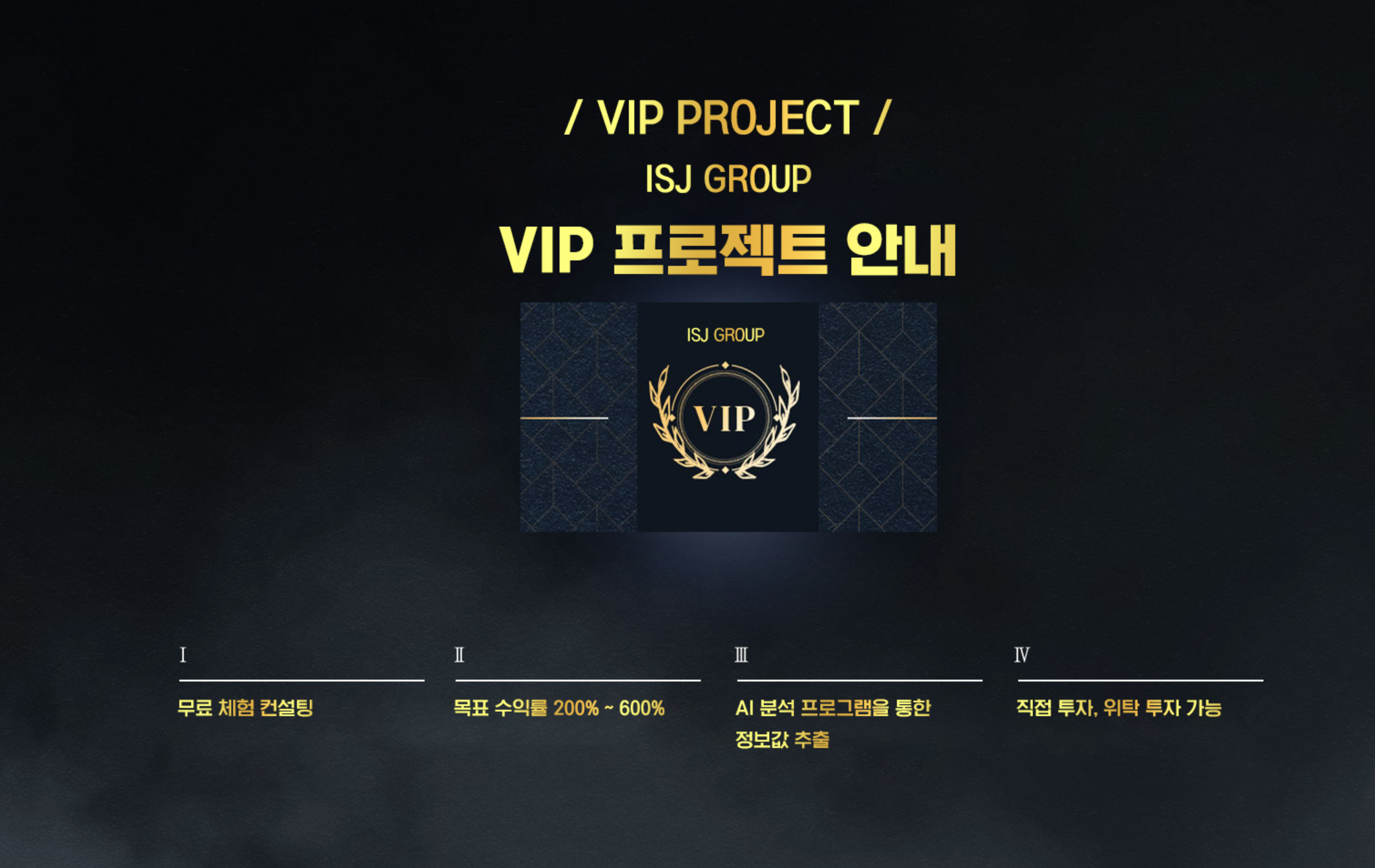 본 사안은 '주식회사 ISJ 그룹'이라는 투자회사를 표방하여 '금 (XAU/USD) 2분거래', '나스닥 지수거래' 등 해외옵션 등을 통해 리딩 프로젝트를 시작한다고 주장하며 이후 본 프로젝트 시행을 하면 500%이상의 수익률을 얻을 수 있다고 홍보하면서 피해자들에게 투자를 유도하고 있는 사안입니다. [*****실제 인물 및 회사와는 전혀 무관한 사칭형 사기조직이기 때문에 절대 주의를 요합니다.].