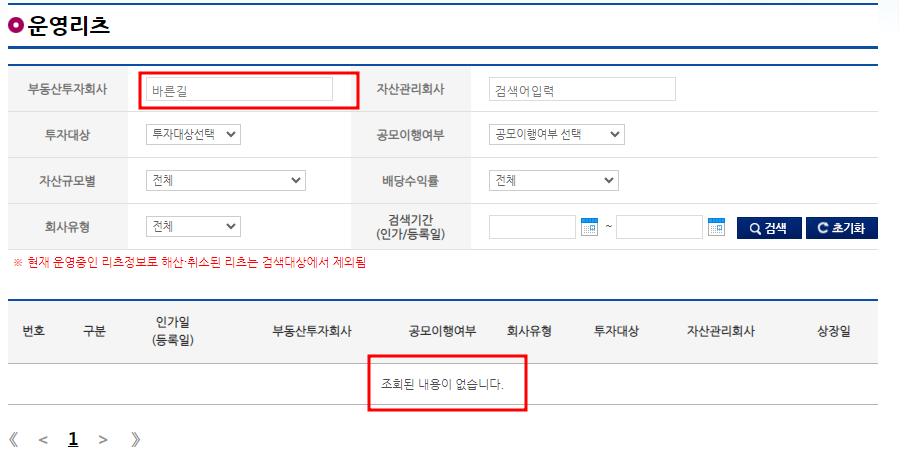 <국토교통부 조회상에도 바른길리츠라는 회사는 존재하지 않습니다. 즉 리츠가 아님에도 리츠라고 사칭하는 것입니다.>