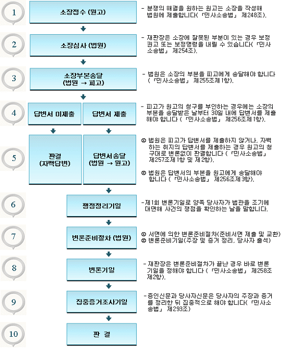 법원을 통해 중재를 받는것 입니다. 보편적 민사소송 흐름은 아래 사진을 참고하시되,