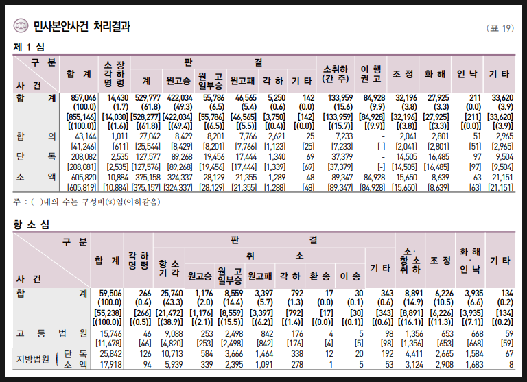 2023년 법원이 발표한 민사소송 통계에 따르면, 1심과 항소심 진행사건을 모두 합산 하였을 때