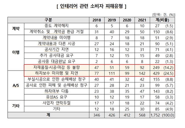 2022년 한국소비자원이 발표한 통계자료에 따르면 인테리어 관련 소비자 피해는