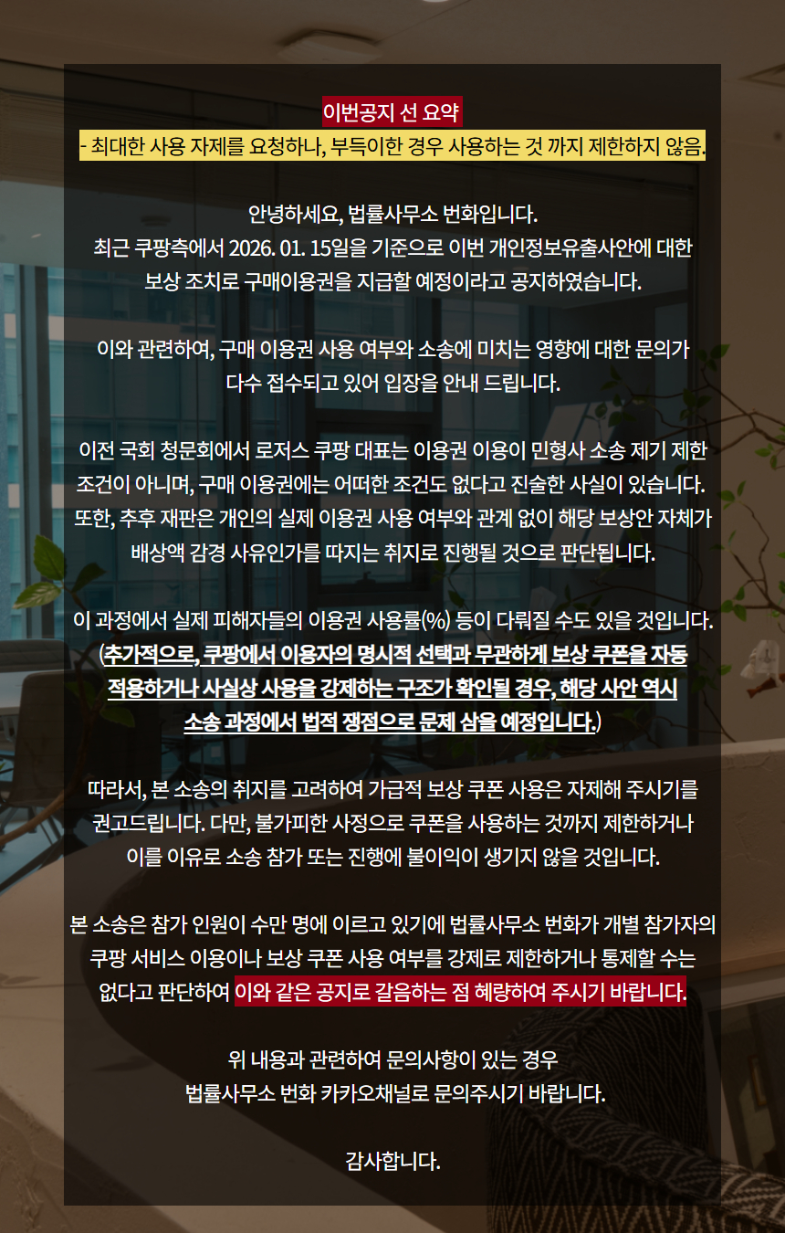 법률사무소 번화 [공지] 쿠팡 보상 이용권 관련 안내 tlstmddn 2026. 1. 14. 공유하기 게시글 관리 법률사무소 번화 저작자표시 비영리 변경금지 (새창열림) '법률사무소 번화' 카테고리의 다른 글 쿠팡 단체소송 조회 시스템 및 2차 접수 게시 안내 (0) 2026.01.13 쿠팡 단체소송 현황 조회 사이트 오픈 안내 (0) 2026.01.05 '법률사무소 번화' 관련글 쿠팡 단체소송 조회 시스템 및 2차 접수 게시 안내 쿠팡 단체소송 현황 조회 사이트 오픈 안내