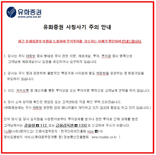 또한 사기 일당이 피해자들에게 혼동을 주어 그 신빙성을 더하기 위해 참고한 것으로 보이는 실제 존재하는 합법적인 증권회사 유화증권에서도 자신들을 사칭하는 사기일당을 조심하라는 내용의 공지문을 올리기도 하였습니다.