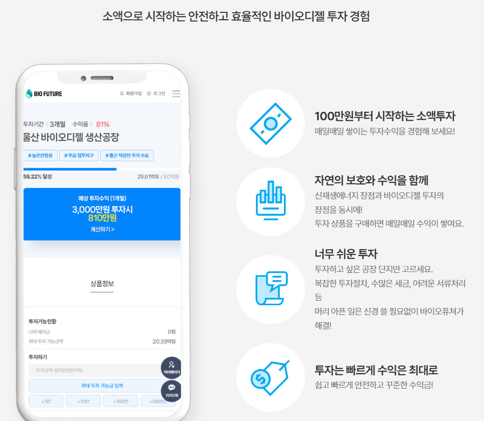 그렇게 투자를 마친 피해자는 유튜브 동영상에서 안내한 대로 바이오퓨쳐 홈페이지의 바이오디젤 상품탭을 통하여 원하는 제품에 투자를 신청하게 되고 이후 발급된 대포통장 계좌로 투자를 입금하면 투자는 완료되게 됩니다.