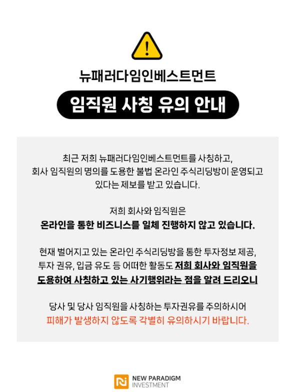 본 사안은 본인들이 투자 회사인 뉴패러다임인베스트먼트의 관계자이며, 주식 리딩, 공모주 청약, 외자기관 계좌 이용 등의 투자를 통해 엄청난 수익을 얻을 수 있다고 홍보하면서 피해자들에게 투자를 유도하고 있는 사안입니다. [*****실제 인물 및 회사와는 전혀 무관한 "사칭형 사기조직"이기 때문에 절대 주의를 요합니다.].