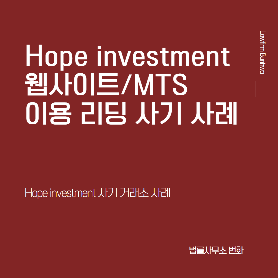 hope investment(호프 인베스트먼트)를 표방/사칭하는 이 사기 일당들은 여러 대포통장 계좌를 사용하고 있으며, 이후 투자금을 지급하는 경우 일정 기간동안 실제로 수익이 나는 것 처럼 투자자들을 기망하고, 추후에는 추가금을 납입해야만 인출이 가능하다거나, 수수료를 먼저 납부해야 출금이 가능하다는 취지로 안내하면서, 중도해지도 불가능하고 원금 회수도 불가능하다면서 투자금의 회수를 거부하는 방식으로 피해자들의 금원을 편취하는 상황이 빈번하게 일어나고 있습니다.