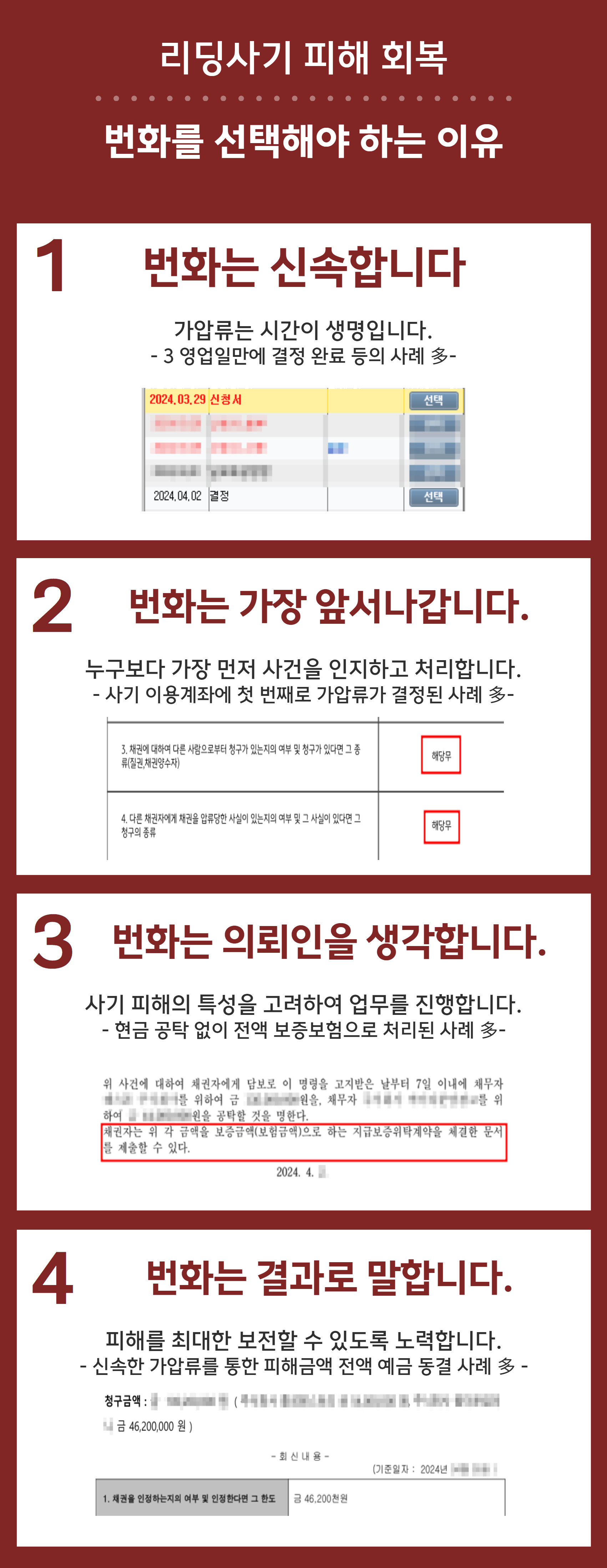 법률사무소 번화에서는 다양한 금융 범죄 및 투자 사기를 처리하고 대응한 노하우가 축적되어 있으며, 다수의 예금채권가압류결정을 통해 피해자의 피해금을 일부나마 보전받을 수 있도록 도와드린 경험이 있습니다. 온라인 결제 대행 사기의 특성상 매우 빠르게 대응하는 것을 원칙으로 하고 있고, 특히 형사 전문 변호사와 금융 전문 변호사의 협업을 통해 형사절차와 가압류절차의 동시진행이 신속하게 가능하니, 언제든지 편하게 문의주시기 바랍니다.