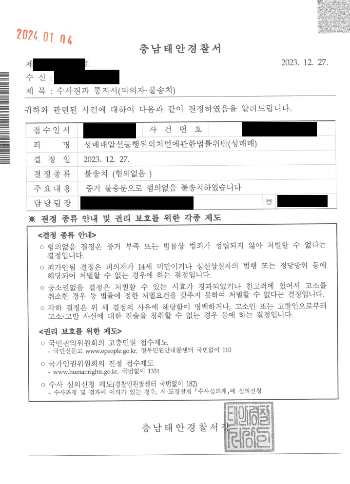 위 수사결과 통지서의 경우 피의자가 성매매 혐의로 조사 받은 건에 대하여 불송치를 받은 사례의 내용입니다.
