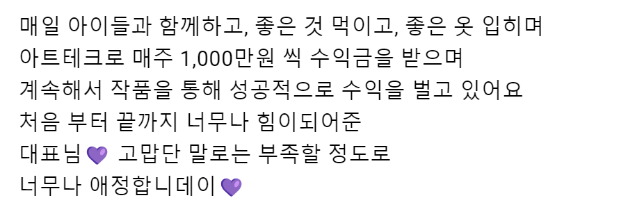 그럼에도 너무나도 그럴듯하게 만들어 놓은 터라 피해자들은 자신이 속고 있는지도 모르고 계속하여 투자를 이어나갑니다. 더욱이 가해자들은 피해자들이 자신이 사기를 당하고 있다는 것을 인지하지 못하게 하기 위하여 그럴 듯한 홈페이지를 만들어 놓는 것도 모자라, 블로그 글 등을 통하여 마치 동백아트갤러리의 사칭업체가 정상적인 업체인 것 처럼 가장하는 등 철저하게 피해자들의 눈과 귀를 가리는 파렴치한 행동까지 하였습니다.