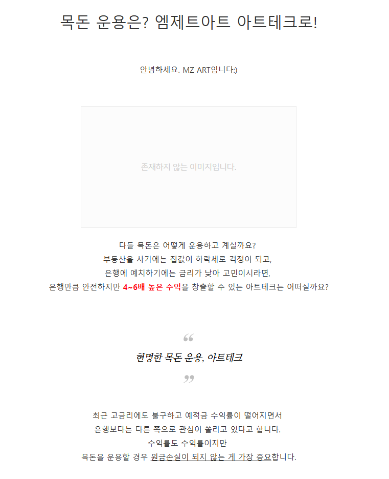 오늘은 한국의 미술갤러리인 MZ아트갤러리(MZ아트, 엠제트아트)라는 회사명으로 피해자들에게 접근한 뒤 미술품 저작권 투자를 유도하며 계속하여 많은 투자금을 지급하게 한 후 나중에는 투자금을 돌려주지 않는 폰지사기 사례를 소개해드리겠습니다.