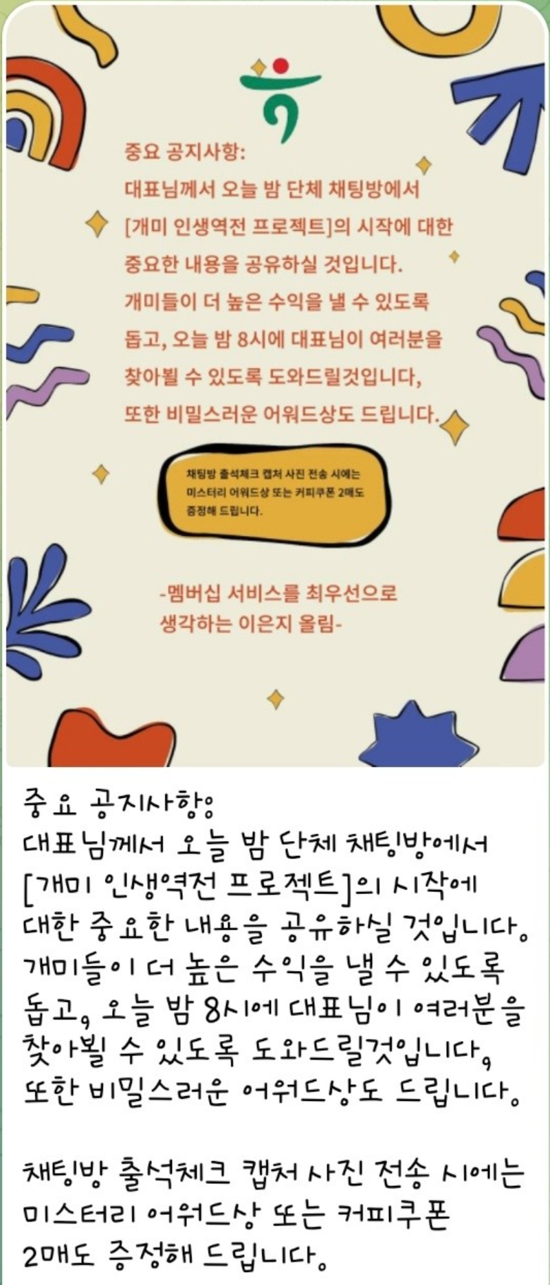이들이 운영하는 밴드에서는 특징적으로 투자전문가로 김태훈 대표, 이은지 매니저 등의 이름을 사용하는 사칭 계정들을 통해 적극적인 프로젝트 참여를 유도하고, 이에 참여하지 않으면 밴드에서 강퇴시키는 등의 방식으로 밴드를 운용하였으며 나중에는 청약한 공모주가 배정되었으니 추가금을 납입해야 계좌에 있는 자금을 운용할 수 있다는 핑계로 투자금을 돌려주지 않았습니다. 위와 같은 밴드에 참여하고 계시는 분들은 특히 투자금을 납입하지 않도록 주의하시기 바랍니다. 이들은 피해자들이 투자금의 출금을 요구하면 수수료를 먼저 납부해야 출금이 가능하다는 취지로 안내하면서, 중도해지도 불가능하고 원금 회수도 불가능하다면서 투자금의 회수를 거부하는 방식으로 피해자들의 금원을 편취하고 있습니다.