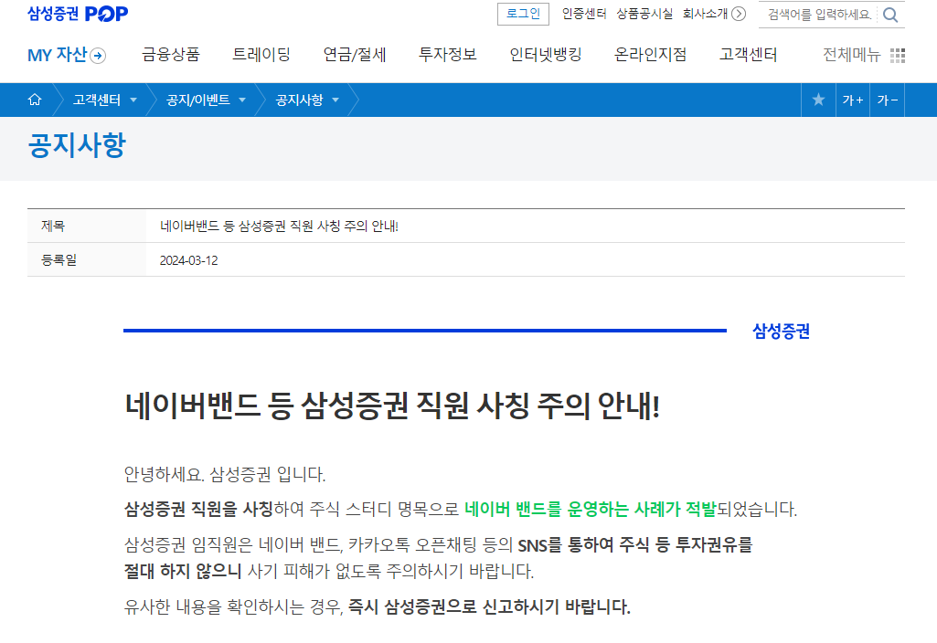 현재 삼성증권 공식 홈페이지에서도 이러한 불법 사기 밴드방을 주의하라는 점을 공지하고 있으며 사칭 여부는 지점 혹은 패밀리센터를 통하여 꼭 확인할 것을 공지하고 있습니다.