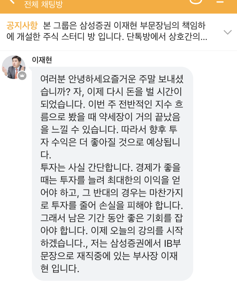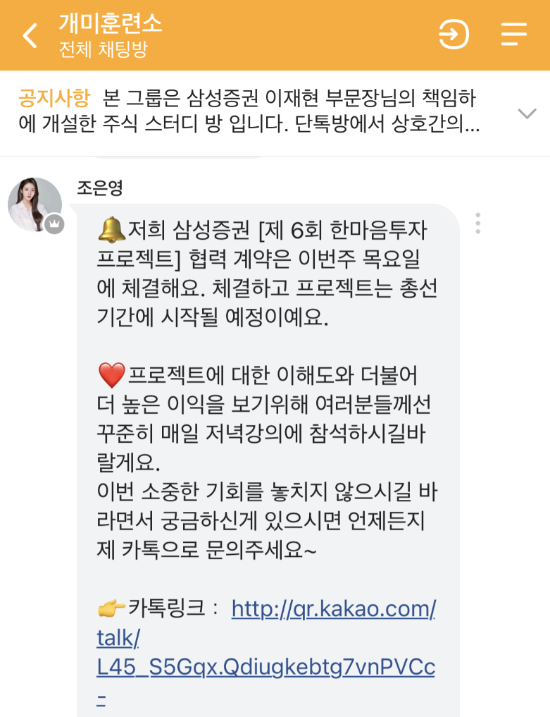 본 사안은 삼성증권을 사칭하여, 협력계약을 체결한다며 총선 기간에 프로젝트를 시작한다고 주장하며 '제6회 한마음투자 프로젝트'를 홍보하고 있는 사안입니다. 해당 그룹은 삼성증권 이재현 부문장의 책임하에 개설한 스터디 방[*****실제 삼성증권 및 해당 인물과는 전혀 무관한 사칭형 사기조직이기 때문에 절대 주의를 요합니다.]이라고 주장하고 있습니다.