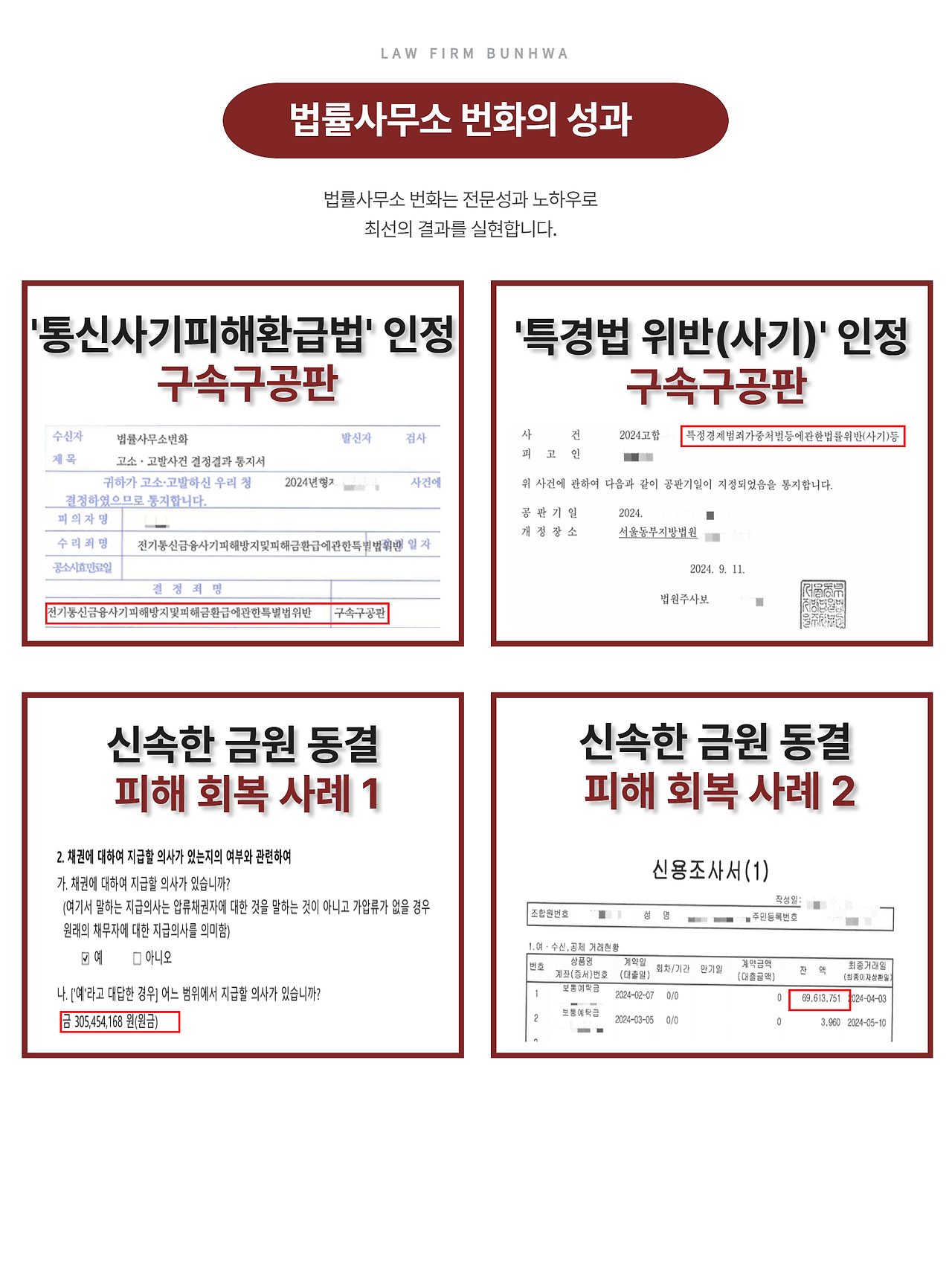 법률사무소 번화에서는 다양한 리딩 투자 사기를 처리하고 대응한 노하우가 축적되어 있으며, 다수의 통신사기피해환급법 상 지급정지를 통해 피해자의 피해금을 일부나마 보전받을 수 있도록 도와드린 경험이 있습니다. 주식 리딩 투자사기의 특성상 매우 빠르게 대응하는 것을 원칙으로 하고 있고, 특히 형사 전문 변호사와 금융 전문 변호사의 협업을 통해 형사절차와 지급정지절차의 동시진행이 신속하게 가능하니, 언제든지 편하게 문의주시기 바랍니다.