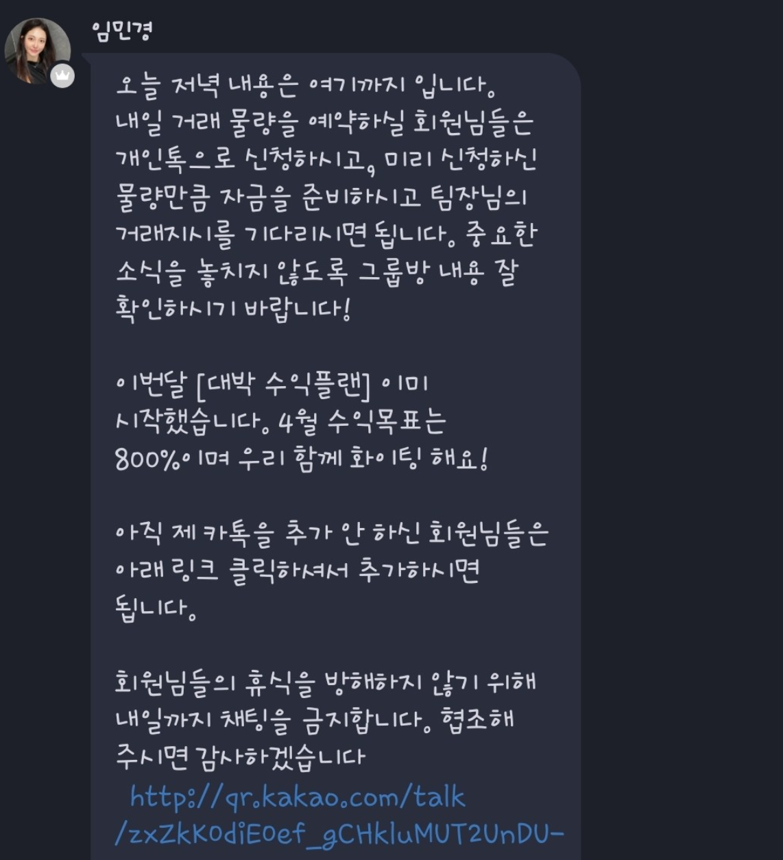 본 사안은 KB증권을 사칭하여 KB증권과 이른바 슈퍼개미로 유명한 '남O관' 대표가 참여하는 '대박수익플랜'이라는 프로젝트를 시작한다고 주장하며 800%이상의 수익률을 얻을 수 있다고 홍보하고 있는 사안입니다. 이는 '2024년 대박주 H' 등의 네이버 밴드방에서 이루어지고 있으며, 밴드방에서 제공된 정보에 따라 거래에 참여하였는데 전체적으로 손실을 보면 손실금 전액을 보상해준다면서 밴드방과 프로젝트에 적극 참여할 것을 권장하였습니다[*****실제 KB증권 및 해당 인물과는 전혀 무관한 사칭형 사기조직이기 때문에 절대 주의를 요합니다.].