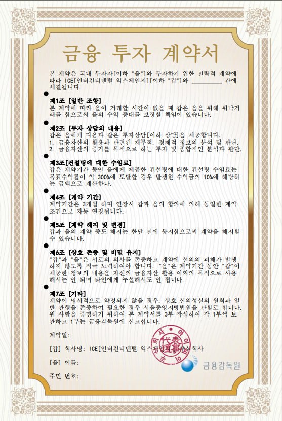 오늘은 '인터콘티넨탈 익스체인지(ICE)'라는 미국의 최대 거래소 회사를 사칭하면서 거래소에 가입을 하여 투자금을 입금하면 입금금액 대비 지원금을 주고 나스닥 1분 거래 기법을 통해 단타매매로 높은 수익률을 얻을 수 있다는 미끼로 투자를 유도하는 내용의 주식거래 리딩방 투자사기 사례를 설명드리려고 합니다.