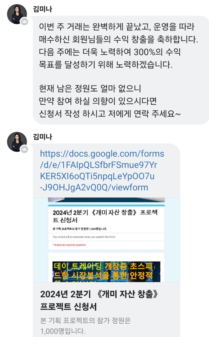 본 사안은 KDB인프라자산운용을 사칭하여 '재테크 교류 커뮤니티'이라는 주식리딩 밴드방을 운영하며 '이승민 교수', '김미나 매니저' 등의 이름으로 '2024 자산확장프로젝트'라는 프로젝트를 시작한다고 주장하며 300%이상의 수익률을 얻을 수 있다고 홍보하면서 피해자들에게 투자를 유도하고 있는 사안입니다. [*****실제 KDB인프라자산운용과는 전혀 무관한 사칭형 사기조직이기 때문에 절대 주의를 요합니다.].
